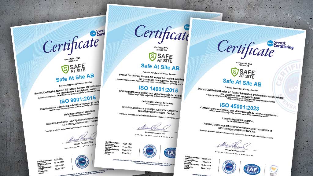 Nu kan vi stolta meddela att vi är certifierade i kvalitet, miljö och arbetsmiljöarbete enligt ISO 9001, ISO 45001 och ISO 14001. Ett kvalitetsledningssystem enligt ISO 9001 säkerställer att vi på ett strukturerat och effektivt sätt jobbar med ständiga förbättringar i våra processer. Med standarden ISO 14001 jobbar vi kontinuerligt med att övervaka miljöaspekter och minimera vår miljöpåverkan i hela organisationens kedja. Vi arbetar även med ett ledningssystem för arbetsmiljö enligt ISO 45001 för att det är en självklarhet att alla på arbetsplatsen ska vara trygga, vara delaktiga i arbetsmiljöarbetet och ha kul på jobbet!