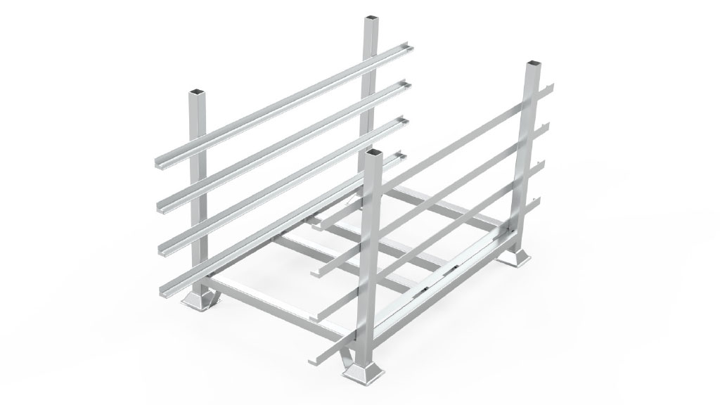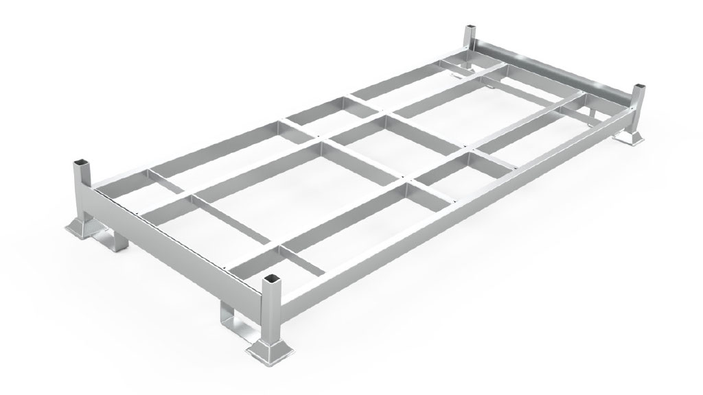 Staplingsbar packningsbox för frakt och hantering av upp till 30 stycken GC-räcken eller G-räcken. Kan lyftas med gafflar eller sling.