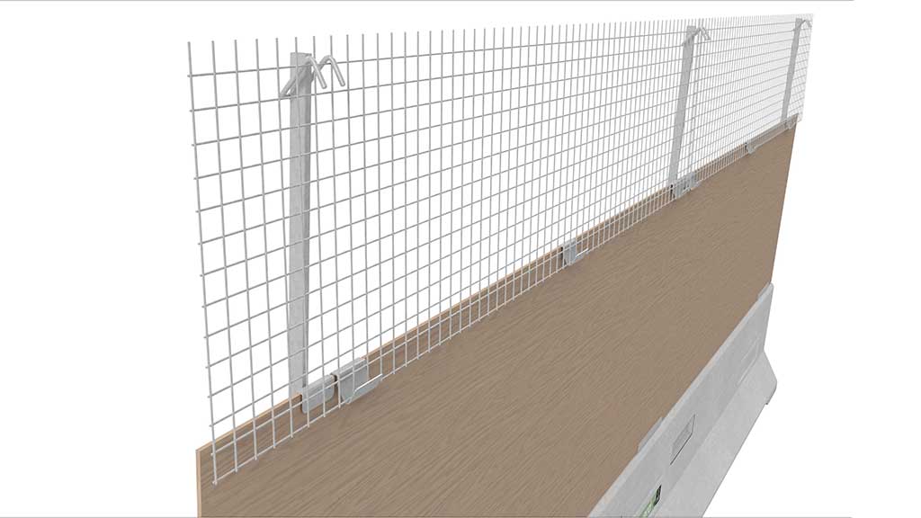 Ett galvaniserat stålnät med uppåtgående trådändar skapar en inbrottssäker arbetsplatsinhägnad.